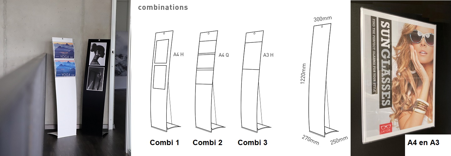 Vrijstaande vloerdisplay Velo Easy. Verkrijgbaar in zwart of wit. Gepoedercoate aluminium voet, aluminium composiet paneel en roestvrijstalen kabel. Inclusief 2 polycarbonaat transparante A4 posterhouders. Afmetingen zie afbeelding. Zie voor meer informatie bijgevoegde afbeeldingen, bijgevoegde PDF en video.