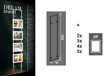 Stabiel magneetframe met een lengte van 250 cm en 28 cm breed, voorzien van een 40W trafo die men met de zuignappen op een ruit bevestigd en waar men de LED verlichte staande A4 posterenveloppen in elke gewenste positie en op elke willekeurige hoogte op kan klikken waarna de magneten hun werk doen. Wijzigen van positie geen probleem, want u trekt ze eraf en zet ze in andere positie weer op het magneetframe. De passe-partout wordt standaard geleverd in zilverkleur grijs, zwart, wit en spiegelend chroom. Bij bestelling gewenste kleur vermelden. De LED verlichte posterenveloppen zijn voorzien van laag voltage LED verlichting met een verwachte levensduur van ca. 50.000 uur. Zij verlichten elke standaard papierprint of desgewenste geprint backlit papier dat een briljanter effect geeft. Door het unieke concept van het lichtpaneel zijn er geen donkere spots en geeft het een egale uitlichting. De prints kunnen zeer eenvoudig verwisseld worden. Door de toepassing van LED's is het energieverbruik ook beperkt. Ook verkrijgbaar in plafond c.q. wand- en vrijstaande uitvoering. Compleet stekkerklaar systeem.
