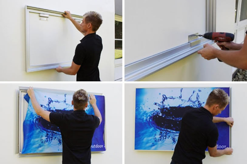 Deze onverlichte outdoor textielframes zijn uw oplossing voor een elegante presentatie van full colour textielprints die voorzien zijn van een silicone strip die men in het profiel schuift. Door het aanwezig klapprofiel dat men op het doek klapt is deze constructie geschikt voor buitentoepassingen. De minimale afmeting is 0,8x0,8 m de maximale afmeting is aan u. Het aluminium frame heeft een diepte van 70 mm. Het klapprofiel aan de voorkant heeft een breedte van 10 mm. Prijzen van frame met f.c. pees-spandoek dienen opgevraagd te worden. Voor meer info over dit product kunt u ook het filmpje bekijken.