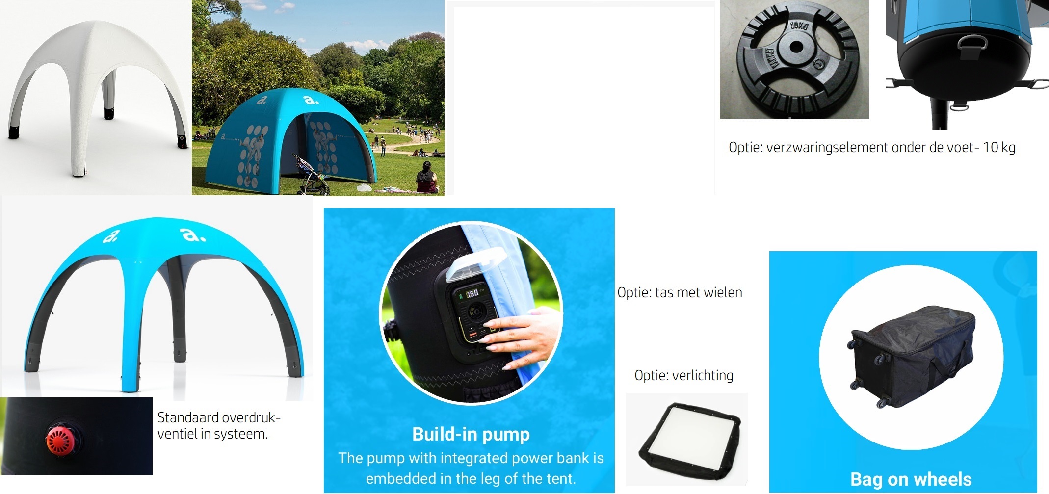 Een slimme evenementent die je stressvrij kunt opzetten. Ben je het zat om op evenementen te zoeken naar stopcontacten, gehaast te pompen en met in de knoop geraakte kabels te worstelen? De promotietent AIR automatic maakt je leven een stuk gemakkelijker. Dankzij een ingebouwde, op batterijen werkende pomp werkt hij onafhankelijk van elke stroombron. De complete set is klaar voor gebruik, waar je ook bent – op het strand, in de bergen of in de stad. Het is de meest geavanceerde outdoortent in ons assortiment. De pomp met ingebouwde batterij kan je tent tot wel vier keer opblazen met één lading. En als de batterij leeg is, kun je de meegeleverde powerbank gebruiken. Bovendien heeft de pomp een automatische heropblaasfunctie bij drukverlies. Hij heeft ook een ingebouwde zaklamp die het opzetten in het donker vergemakkelijkt. Het ventielsysteem beschermt de structuur tegen overmatig druk, terwijl de grijze luchtverdeelbuizen aan de bovenkant van de tent zorgen voor een gelijkmatige vulling. Het systeem handhaaft een constante druk in de structuur en blaast deze indien nodig automatisch op. De tent is 5,8x5,8 m en 3,8 m hoog. Gewicht is 52 kg. De geprinte daken met poten en/of wanden kunnen eenvoudige vervangen worden door nieuwe prints. Zie voor printopmaak van het dak en potenbijgevoegde PDF. Voor print drukbestand aanleveren (tegen meerprijs kunnen wij dat ook voor u verzorgen). Na ontvangst van uw drukbestand controleren wij deze zorgvuldig en voor productie sturen wij u een drukproef ter goedkeuring. Zie voor het principe van een dergelijke opblaasbare tent ook bijgaande video.Opties: 1 tot 4 bedrukte zijwanden die men er inritst, trollytas met wielen, verlichting, verzwaringselementen van 10 kg voor onder de poten. Zie voor de opties ook de afbeeldingen.